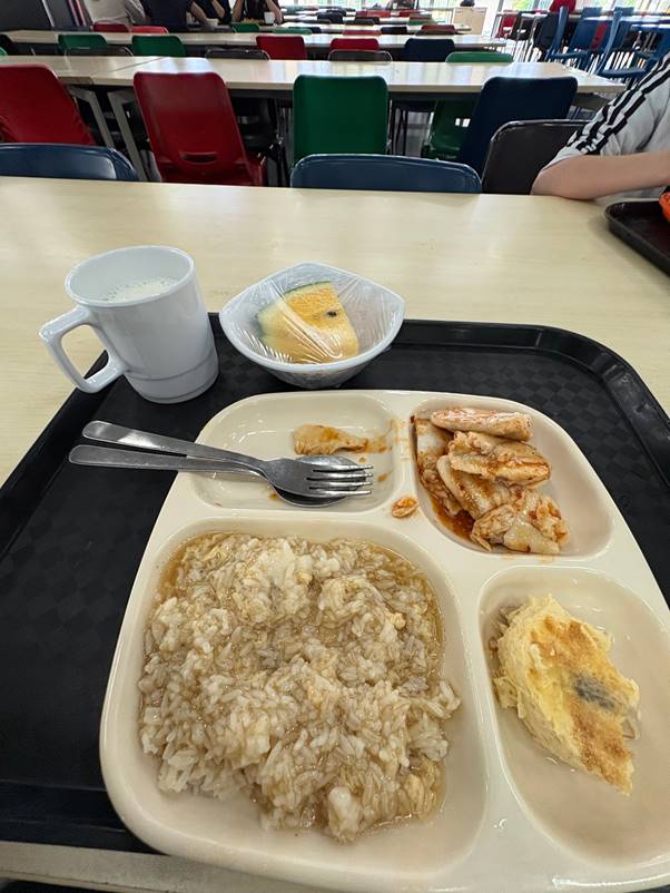 By lunch, I was starving since I hadn’t eaten breakfast. The meal was surprisingly good—the sauce and fish paired with rice tasted amazing. I had a cup of milk and even got to try something new: yellow watermelon. It was the first time it was served this term. I was looking forward to it, but there were too many big seeds, which spoiled the experience a little.